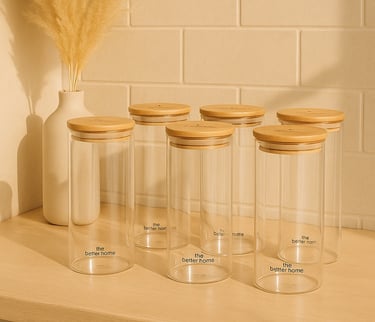 These 300 ml glass jars are ideal for storing spices, snacks, or dry goods. The bamboo lids provide an airtight seal, preserving freshness, while the clear glass and natural wood tones align with a neutral kitchen palette.