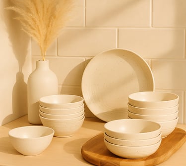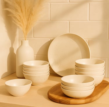 Simple yet stunning. This 16-piece ceramic set gives a handcrafted, natural vibe with a subtle speckled texture — perfect for a calm dining aesthetic